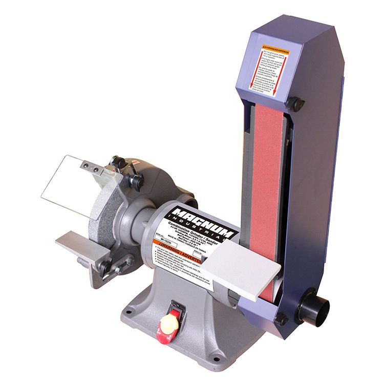 Grind, deburr, sand, sharpen and more with the Magnum Industrial MI-16250 Benchtop Belt Sander / Grinder. It's a versatile and reliable asset for any workshop. It features a sanding belt that pivots from 0 to 60 degrees, and locks in at any angle in between. In addition, the 8" grinding wheel spins at 3,450 rpm, so you can finish metal, sharpen tools and more.